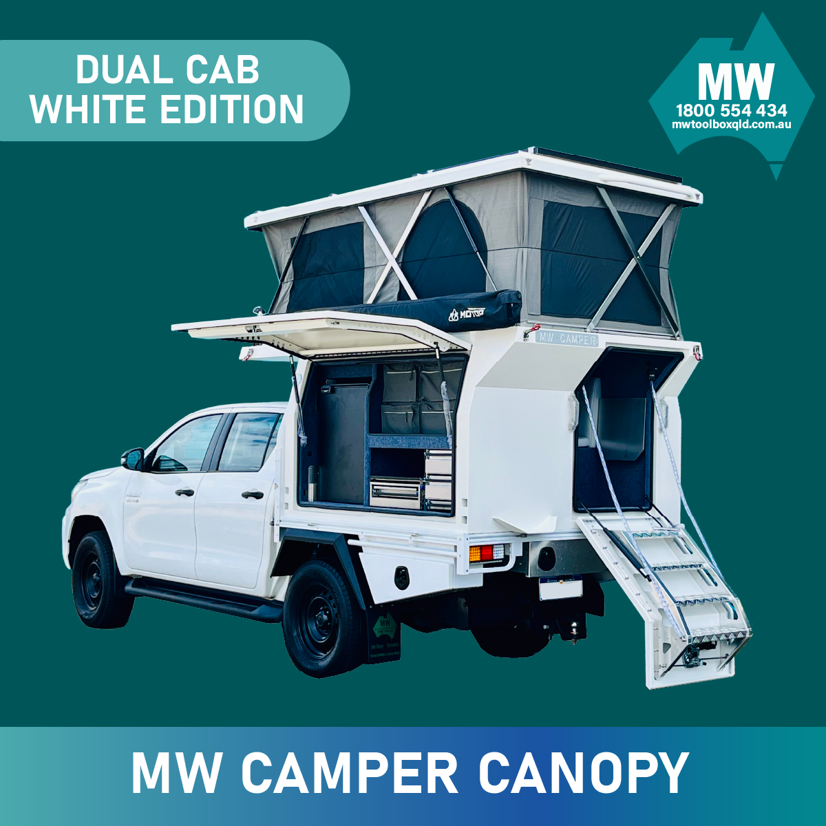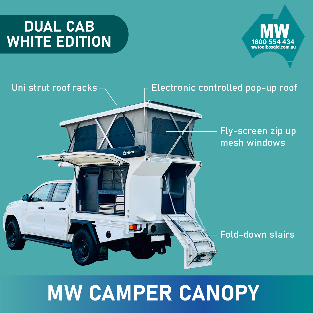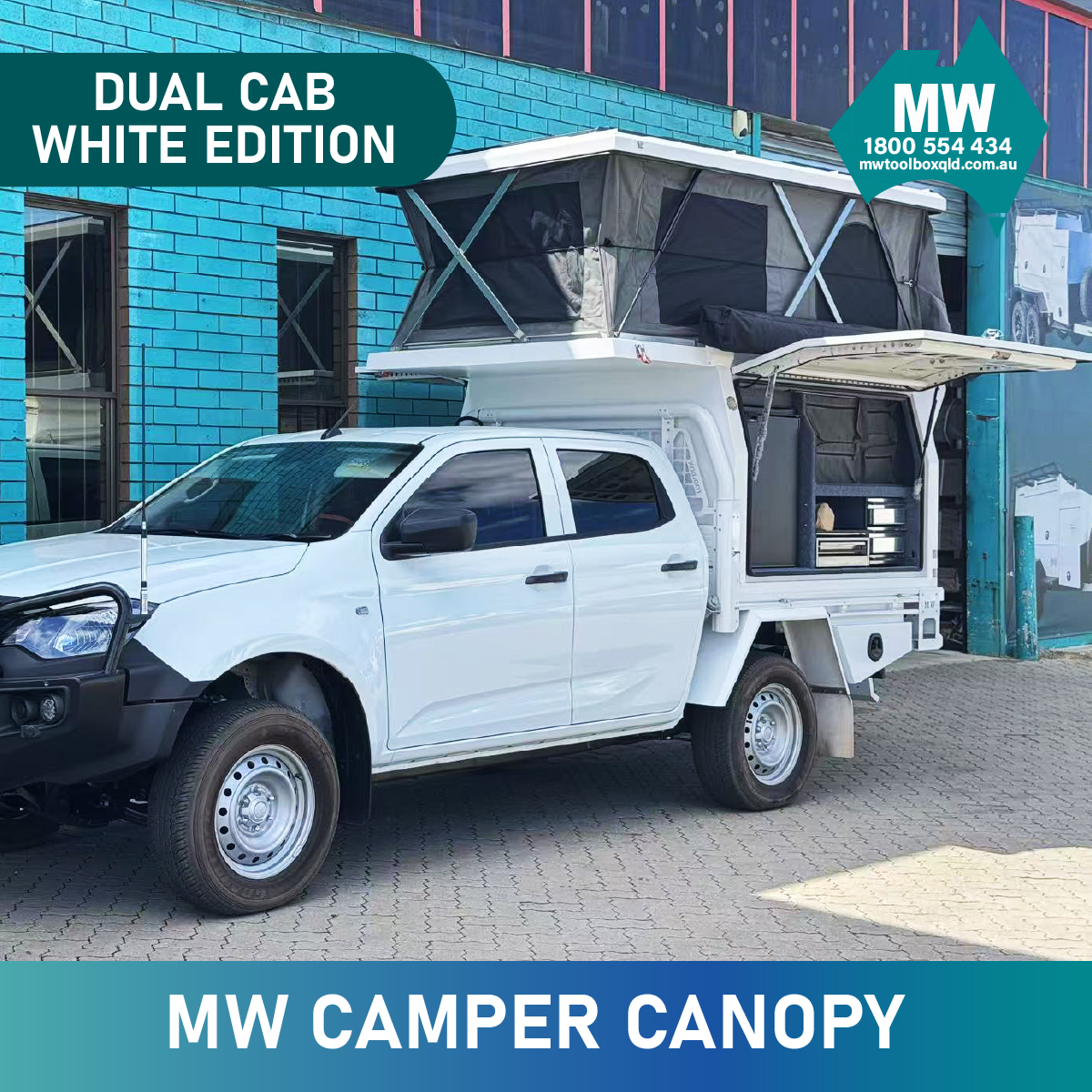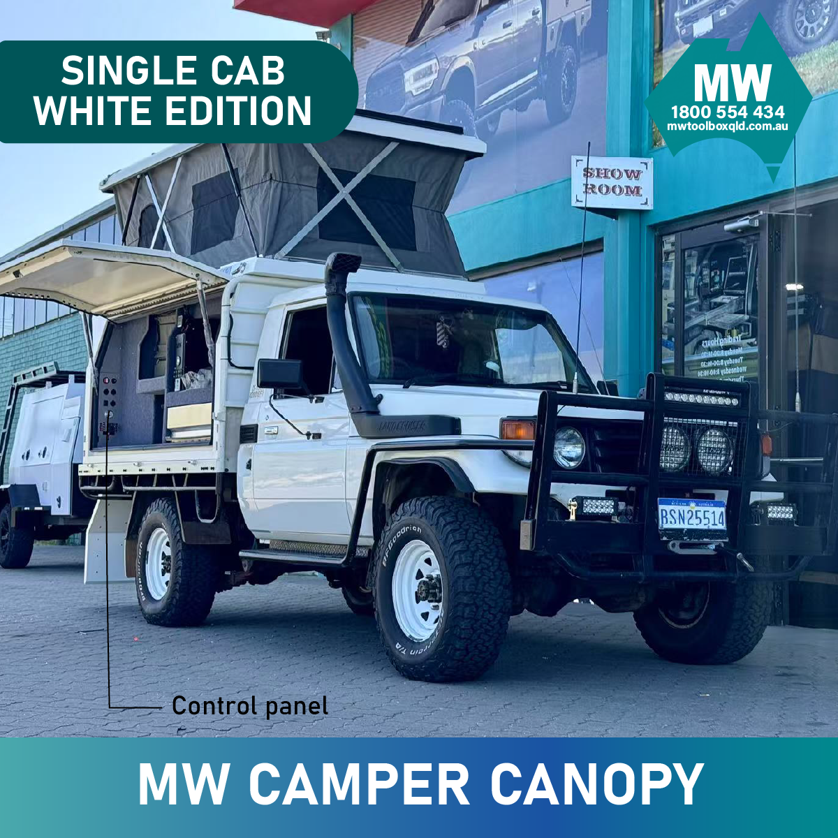 MW Camper Canopy is a compact unit dedicated to outback adventures. It’s well thought out with everything you need. This jack-off slide on unit gives you a towing free camping experience. Electrical actuated popup roof provides effortless set up to the most comfortable & spacious sleeping space. Built in kitchen section with space for upright fridge and cooktop unit. Full on-board DC electrical system comes ready to go standard. MW Camper Canopy is compatible with almost all ute models (dual cab, extra cab & single cab).