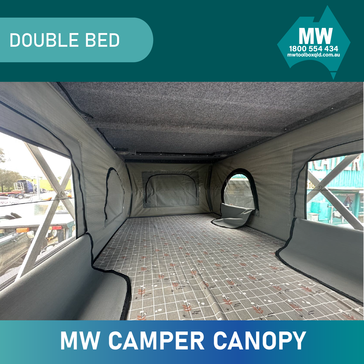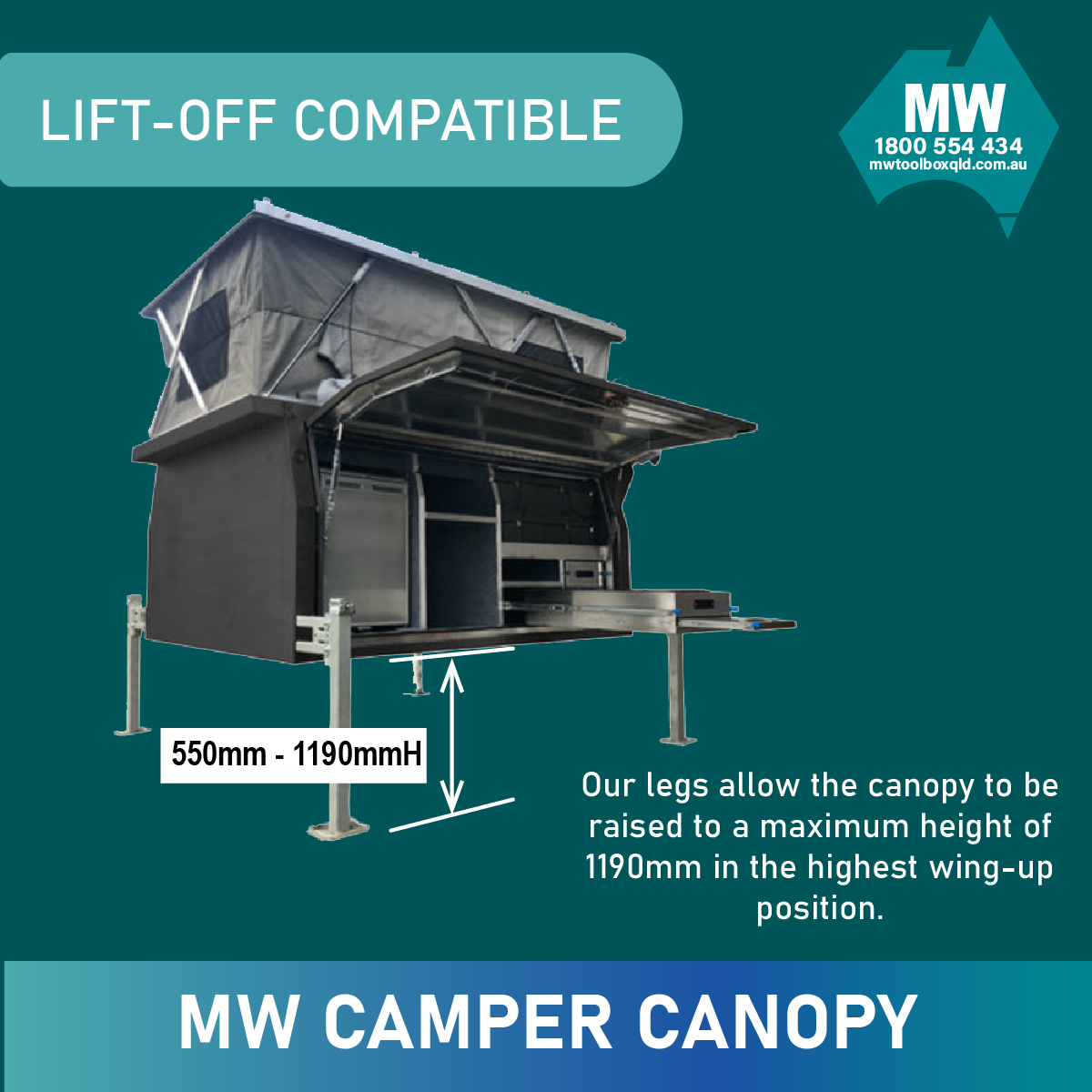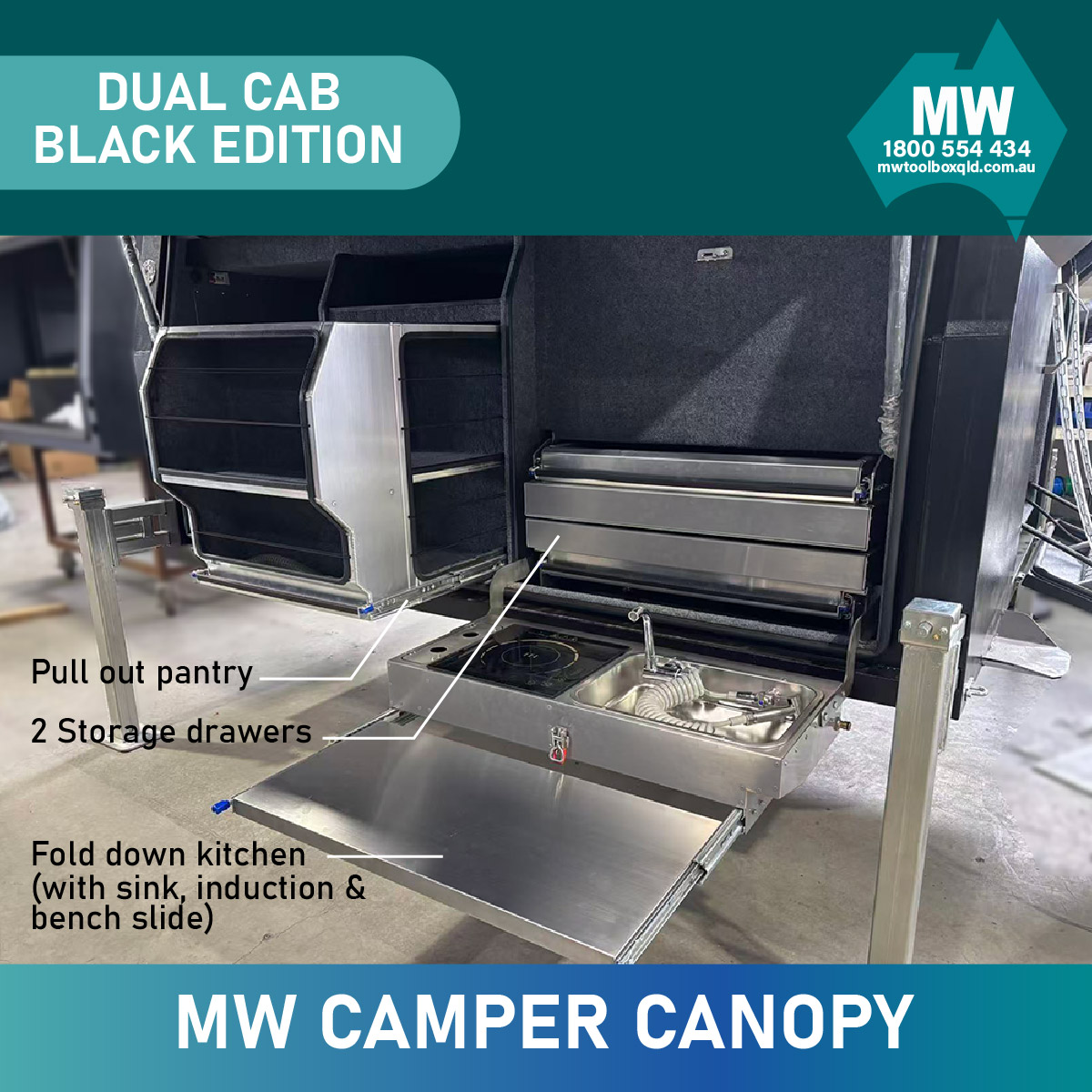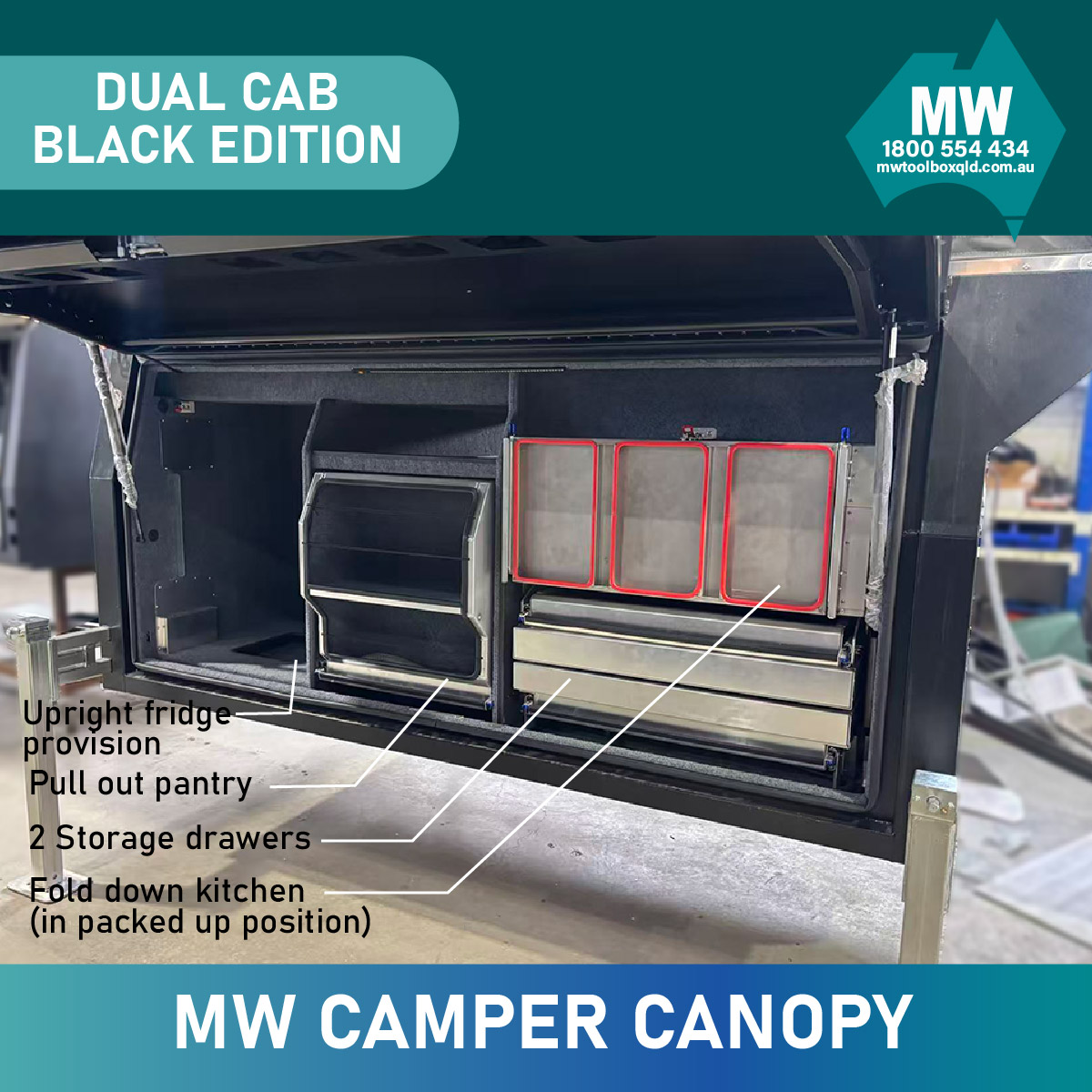 MW Camper Canopy is a compact unit dedicated to outback adventures. It’s well thought out with everything you need. This jack-off slide on unit gives you a towing free camping experience. Electrical actuated popup roof provides effortless set up to the most comfortable & spacious sleeping space. Built in kitchen section with space for upright fridge and cooktop unit. Full on-board DC electrical system comes ready to go standard. MW Camper Canopy is compatible with almost all ute models (dual cab, extra cab & single cab).