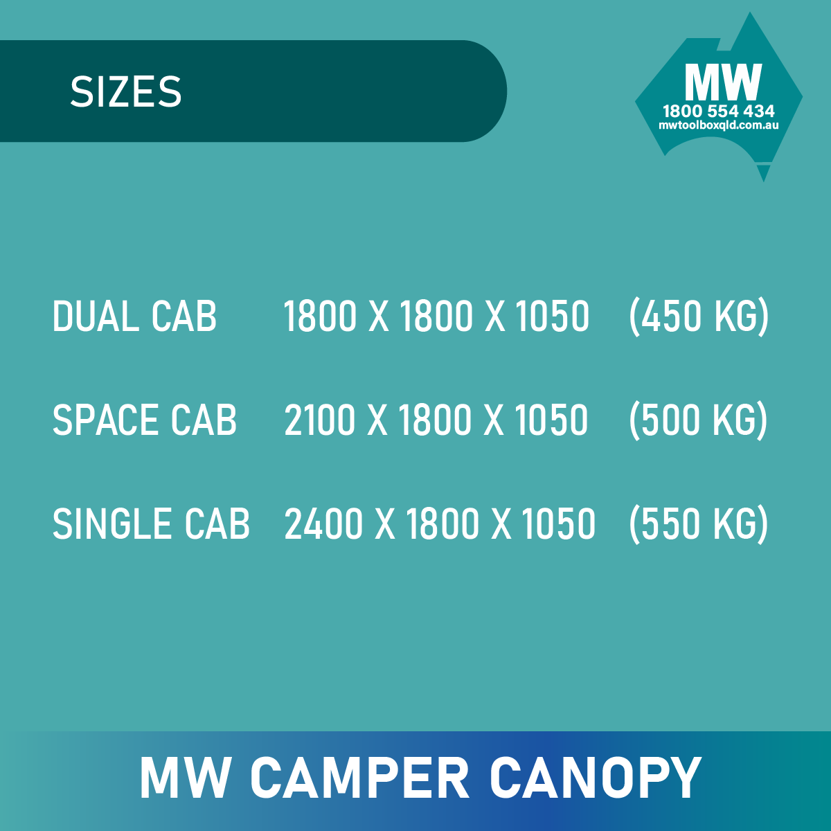 Designed to suit a wide range of vehicles, the MW Camper is available in three different sizes tailored for dual cab, extra cab, and single cab utes. This ensures a precise fit and seamless integration, no matter what you drive.